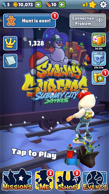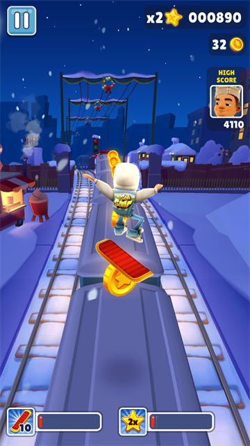 圣诞到,鹿少爷跑,铃儿响叮当~地铁跑酷subwaysurf国际服圣诞节版来了,为了欢聚圣诞节,整个游戏都充满了圣诞节的气息,就连追赶跑酷者的凶保安都换上了圣诞老人的衣服,杰克的也打扮成了精灵的模样,还多了一张新滑板-高音号,并且游戏的精灵系列又添3位新跑酷者,玩家可以和精灵琪琪齐聚双旦!