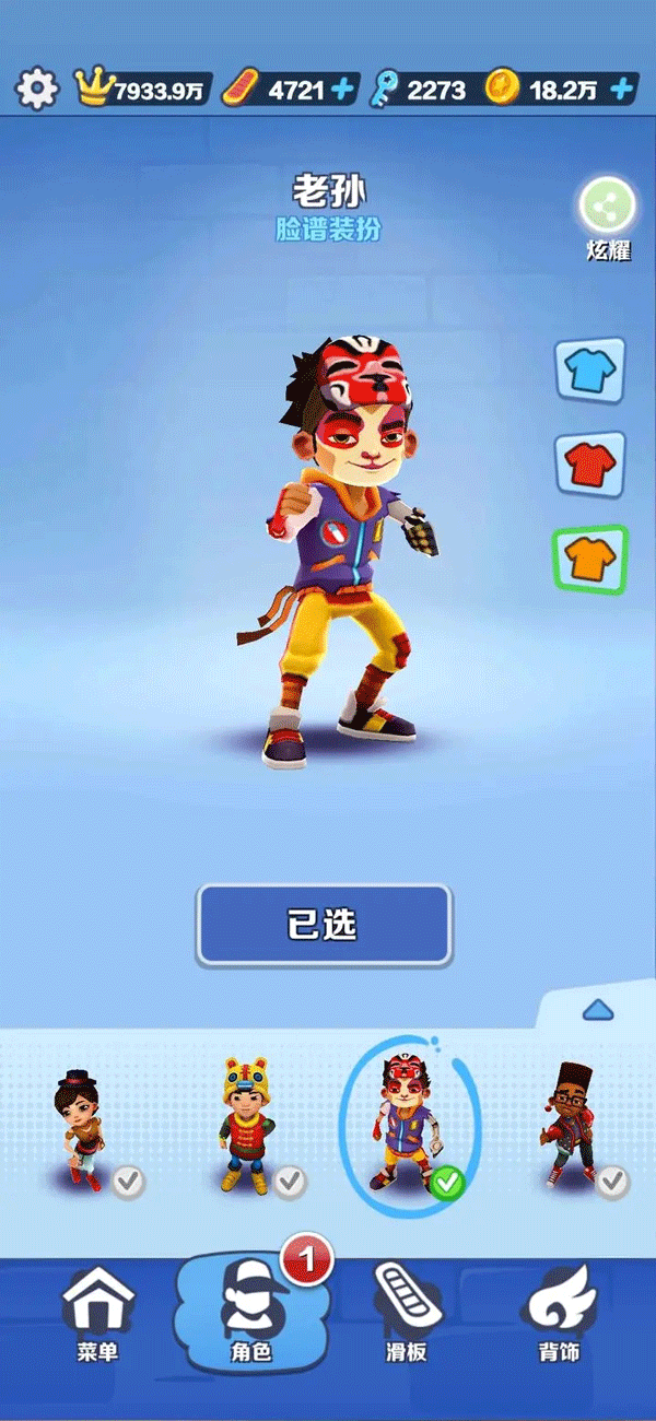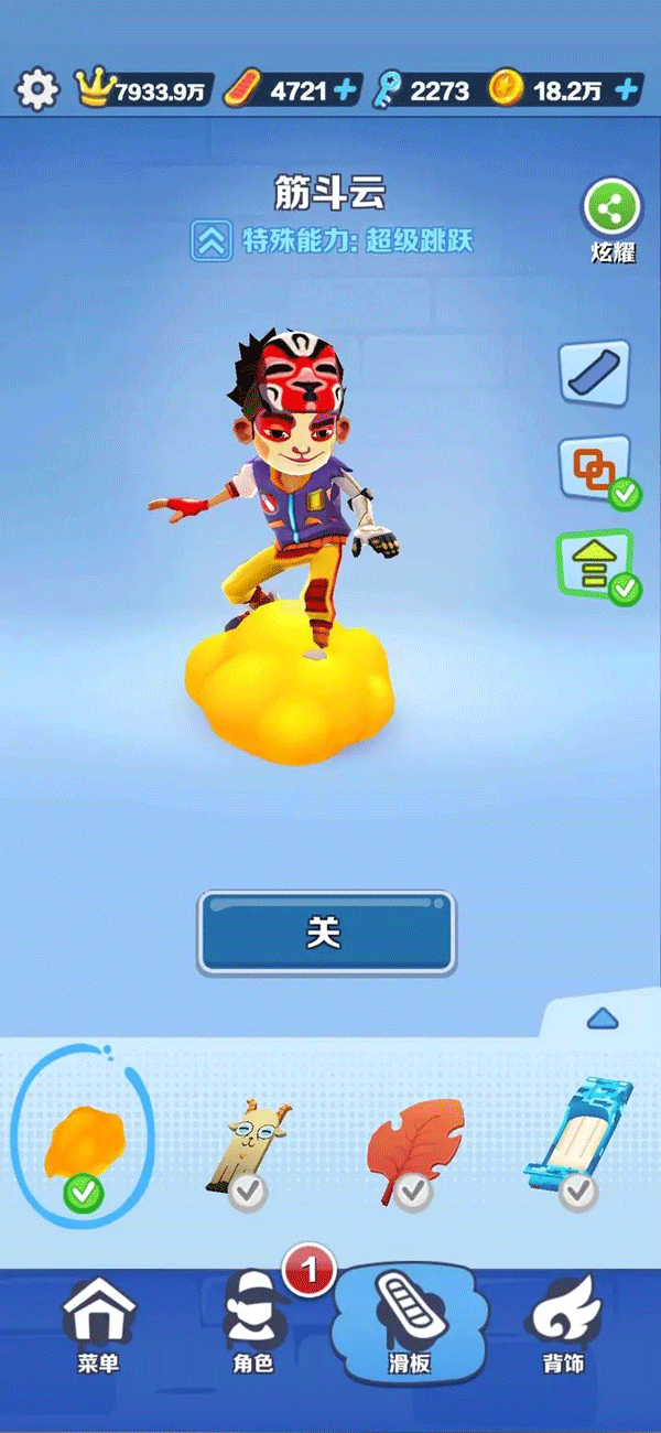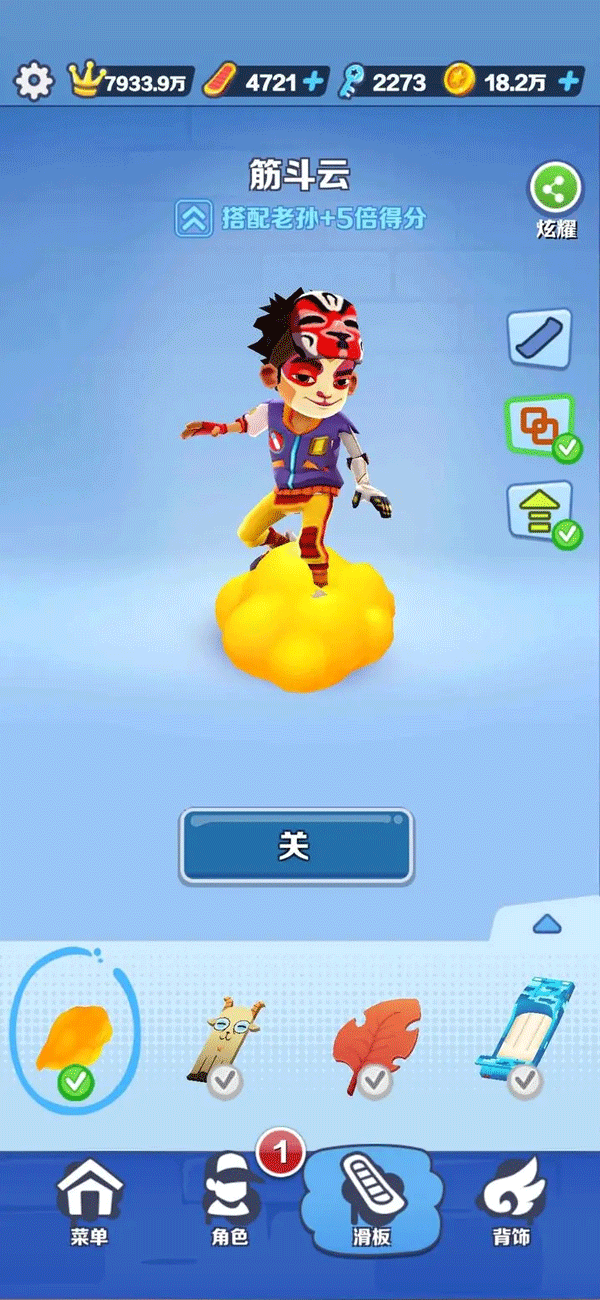 人物滑板推荐选择带有5倍得分和超级跳跃的,就拿作者小编来说吧,选择的是老孙和他的搭配滑板筋斗云,各位地铁跑酷的小伙伴们也可以选择其他人物滑板搭配5倍得分和超级跳跃的套装哦!