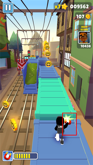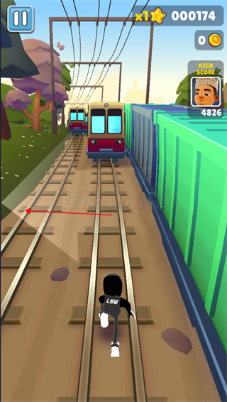 5、通过双击屏幕来启动滑板,滑板会持续一段时间。在没有滑板的情况下,角色撞到火车或者障碍等都会被抓住,游戏终结。但在有滑板的状态下,角色就有了一道保险,撞到火车等的时候,滑板会消失,游戏可以继续进行。