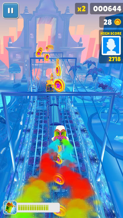 3、地铁跑酷很多道具都会对跳跃产生影响,比如跑鞋、助推器、跳跃道具等,特别是跳跃道具,可以跳到上方吃到很多金币,但是下落时,需要及时变更方向。