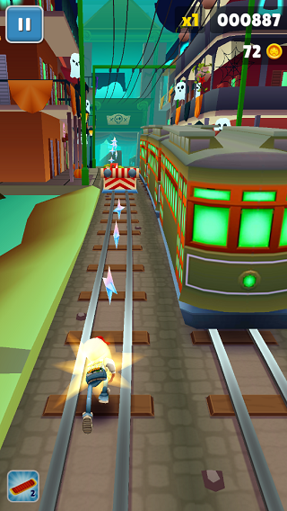 双击屏幕可启动滑板道具,如果在没有启动滑板功能的情况下,角色撞上障碍物或者火车游戏就会结束,而在滑板状态下,等于给角色买了保险,滑板会在撞到障碍物时消失,但游戏可以继续进行。滑板在消失后的几秒内出现冷却时间,当闪烁结束后可通过双击再次启动,没有次数的限制。