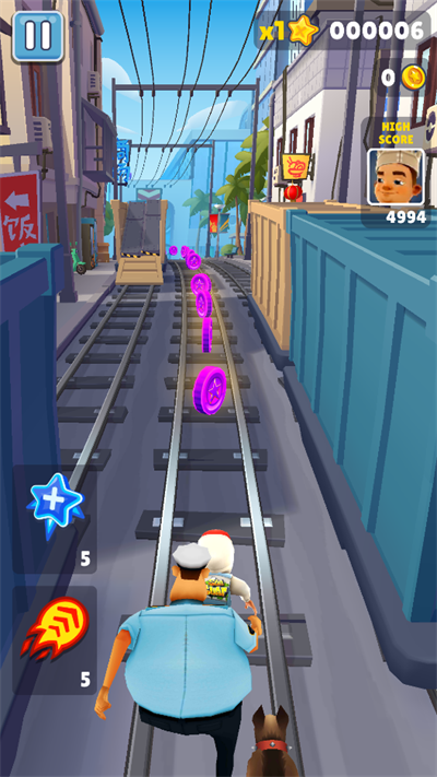 4、控制角色在地铁上驰骋,躲避所有的向你冲来的地铁,还要拾取紫色金币。