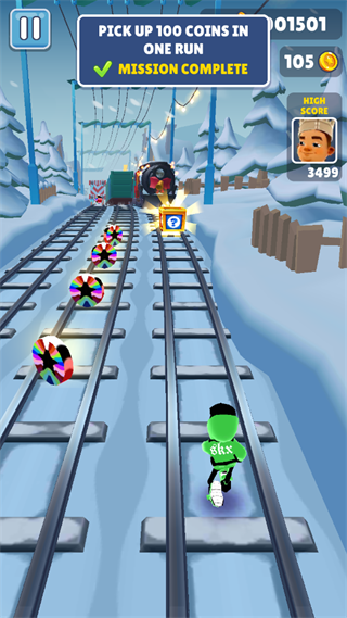 地铁跑酷神链绿杰魔改版是游戏《地铁跑酷》魔改版本,在这个版本中Jake换上了绿色的皮肤,游戏中的金币也改成了彩虹色,随着离金币越来越近,金币还会散发出淡淡的光芒,游戏背景也改成了圣诞的主题,随着跑酷的速度增加,雪会越下越大,给玩家更加真实的圣诞跑酷的体验感。游戏中还修改了滑板的皮肤,可以体验到与原版完全不同的手感。虽然为定制的魔改版本,但是玩法上与原版是一样的,在跑酷过程中,需要躲避障碍物、收集金币,并躲避警察的追捕。游戏的操作非常流畅,只需要左右滑动即可控制角色移动,上下滑控制角色跳跃和翻滚,躲避对应的障碍物操作简单但难度不小,操作上限完全取决于玩家的手法。