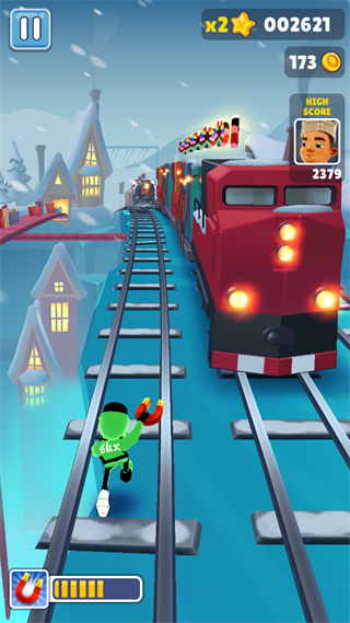 5、通过双击屏幕来启动滑板,滑板会持续一段时间。在没有滑板的情况下,角色撞到火车或者障碍等都会被抓住,游戏终结。但在有滑板的状态下,角色就有了一道保险,撞到火车等的时候,滑板会消失,游戏可以继续进行。