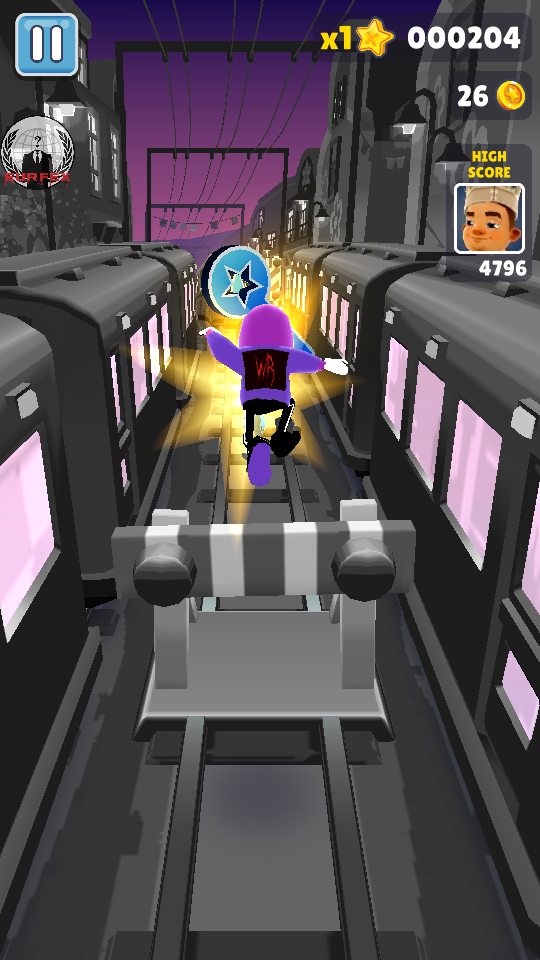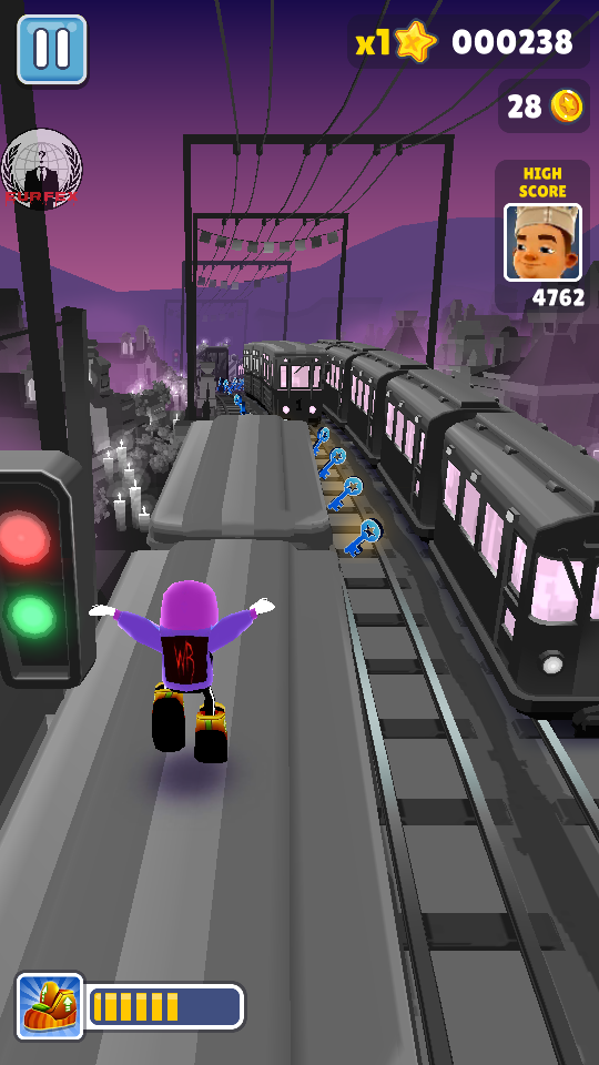地铁跑酷小雾神版本是一款非常好玩的玩家自制跑酷娱乐游戏,游戏风格以黑灰色调为主,杰克变成了黑紫色,金币变成了一把钥匙,可以给玩家带来全新的游戏体验。在游戏中,玩家通过上下左右滑动屏幕来控制角色,从而躲避前方的障碍物以及迎面开来的火车,要是不慎被障碍物绊了一下,很有可能被后方的警察给追上哦~并且在跑酷的同时,玩家还需要多多收集路面上出现的钥匙金币,这些金币可以在商店中购买角色。滑板以及其他道具。另外,途中还会拾取到一些道具,不同道具带来的游戏增益都是不一样的,感兴趣的话,那就快来下载体验吧。