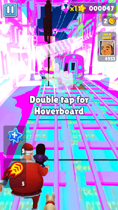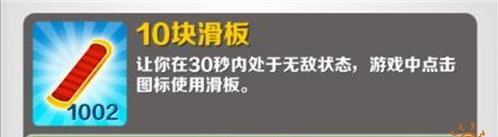 双击屏幕可启动滑板道具,如果在没有启动滑板功能的情况下,角色撞上障碍物或者火车游戏就会结束,而在滑板状态下,等于给角色买了保险,滑板会在撞到障碍物时消失,但游戏可以继续进行。滑板在消失后的几秒内出现冷却时间,当闪烁结束后可通过双击再次启动,没有次数的限制。