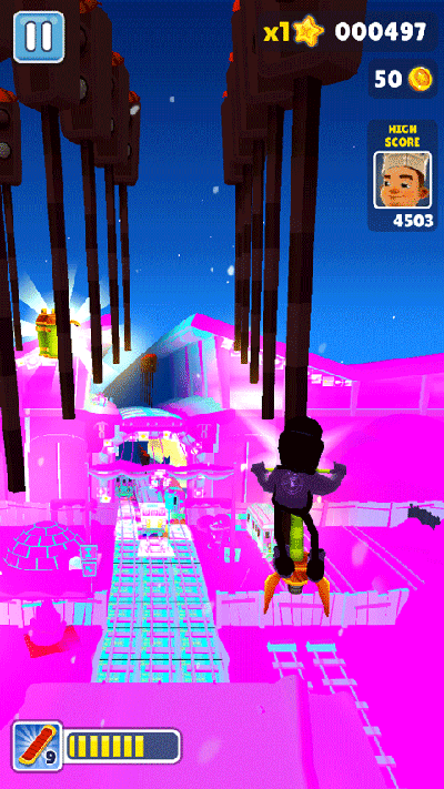 增加角色的弹跳能力,可以跳跃更高更远,在空中停滞的时间更长,不过落地时间很难掌握,使用该道具可以跳上火车,同时也可以在洞口处跳到墙上自杀。不过劝诫新手朋友不要过多使用,一时恍惚做出了错误判断就可能导致游戏结束,然而对于高玩们来说,这却是一款不折不扣的神器,凭借超级运动鞋可省去细微的费神操作,效率提升也十分明显。