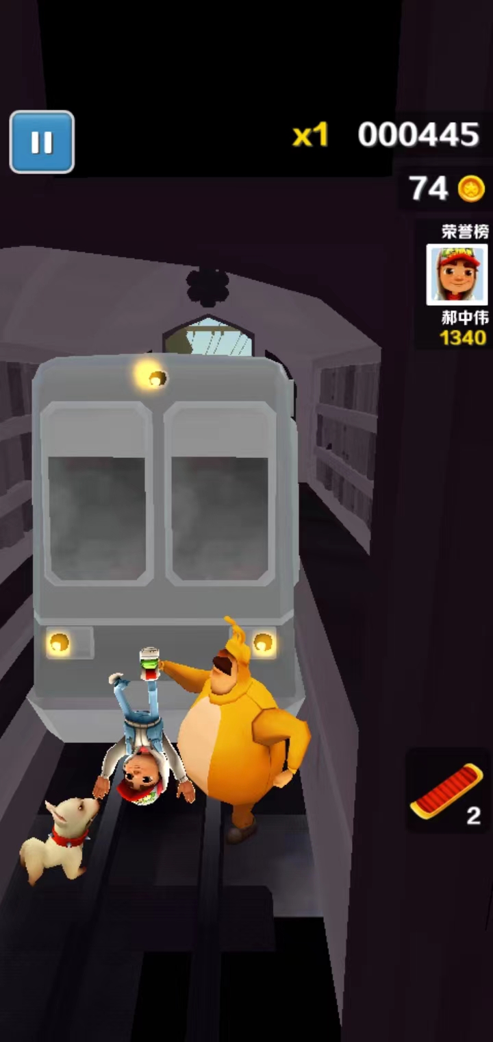 4、双击屏幕或者点击右方的滑板按钮可以出现滑板,当装上火车或者障碍物的时候,游戏还可以继续;