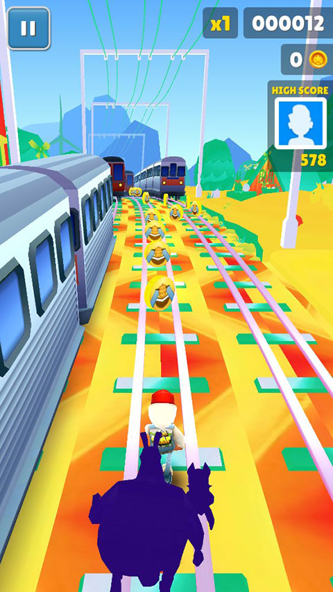 2、双击屏幕,就可以召唤滑板,操控滑板,收集金币,以及可以碰撞火车后,保安不会立即出现。