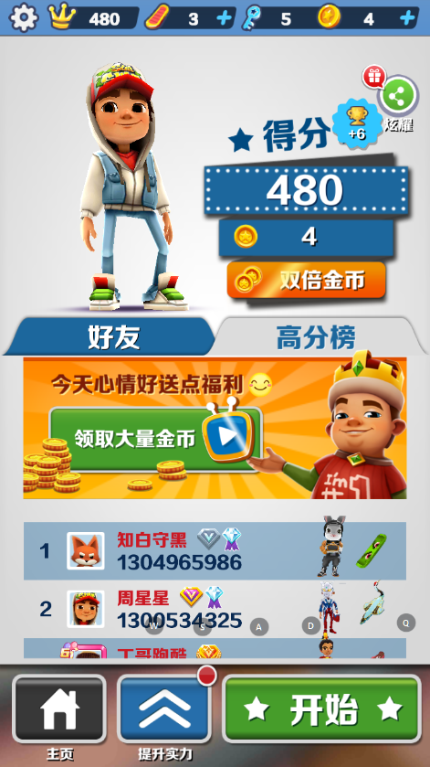 6、当游戏结束后,玩家可以查看好友排行榜以及高分榜(往下滑动);
