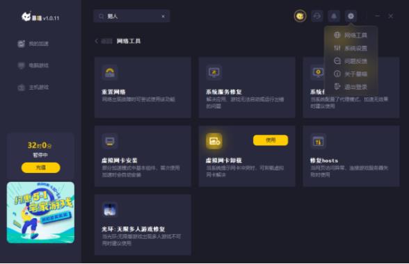 2、如果开启暴喵后,还是不行,可以尝试点击暴喵客户端右上角设置,选择网络工具进行网络重置,并重启路由器 光猫试试。