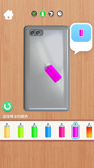 3、接着在手机壳上均匀的喷涂一个喜欢的颜色,注意这时如果右上角弹出一款颜色框,说明客户比较喜欢这个颜色的染料,我们需要找到对应颜色的染料喷涂上去,否则会影响最后的星级和金钱收入。