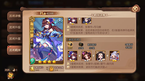 武将羁绊的获得:玩家获得了武将羁绊关系中的所有武将,且武将星级达到要求,即可在武将详情中激活羁绊。