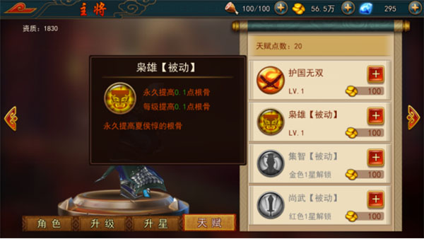 可以提升主将的进攻和防御能力,生命值也越来越高,同时每跨越一个大星级,还能改变主将颜色,解锁新的天赋。对于天赋来说,基础天赋能提升无双技能的伤害,进而提高单主将的战力。通过提升星级解锁新的天赋,可以进一步提高主将的“根骨、力量、抵御”,进而影响主将继承战队属性。同时提升主将战力也会给武魂增加经验值,武魂每次升级会带来战队战力的增加。