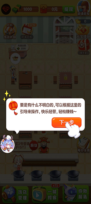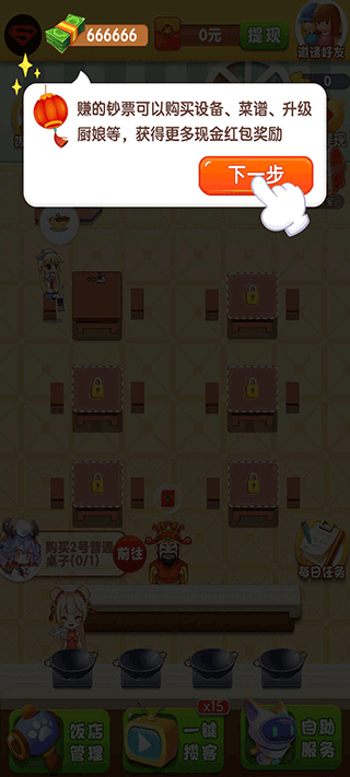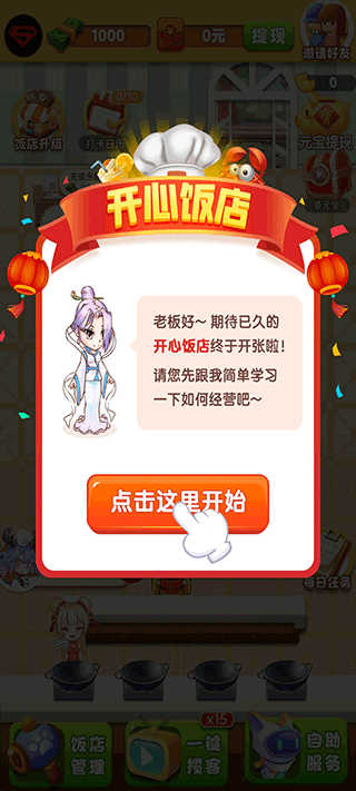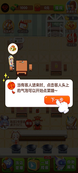 6、新手指引完毕后就可以以自己开始试着经营饭店赚钱了。