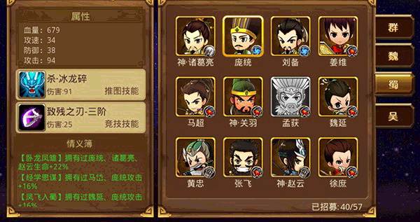 打塔防关卡简称推图。推图的武将选择优先看技能。游戏中武将分绿将、蓝将、红将、金将(金将又分普通金将和神将),金将的能力最高,好的推图技能往往也是金将才有。点开将星录,查看武将簿,各武将技能(推图技能和竞技技能)一览无余(如下图)。