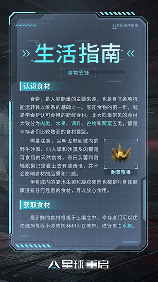 想在《星球:重启》的世界中健康长久地生存下去,学会寻找食材并对其进行烹饪加工是必不可少的。本期生存指南将会给大家详细介绍如何辨认食材、如何获取食材及如何烹饪,各位幸存者一定要仔细阅读,努力做出饱腹又美味的食物哦!
