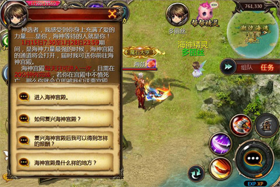 活动期间,海神宫殿的通道将会开启,等级达到50级的神选者可前往海神精灵多丽丝(764,327)处进入海神宫殿开启复兴之路。