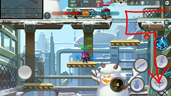 因为之前的时候说了,如果右方有时空战士,那么他就可以踩着滑板在左方旗下抢旗,面对此景是不是很无奈?只能看其拿着旗子就跑自己却什么也做不了,现在告诉你,遇到这种情况就可以用天罡、李之类可以快速解决敌人的英雄来消灭或眩晕他!如图所示,天罡可以踩着第一个台阶跳上去,然后在跳上去的瞬间按下技能放盾,告诉他,想抢旗子可没那么容易,嘿嘿。(其他英雄同理,并且如果抢旗的时候所选英雄不是时空战士或王牌飞行员也可以通过该台阶跳到旗子下方的小半圆圈,也可判定为夺旗成功)