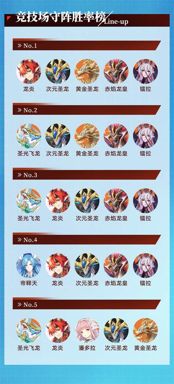 而在竞技场中守阵胜率榜前五名的阵容当中龙炎、黄金圣龙、圣光飞龙的守阵胜率是比较高的~所以奥奇们在守阵的时候可以尝试选择他们哦~