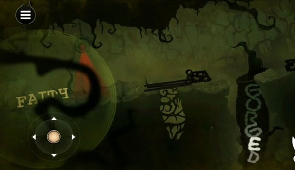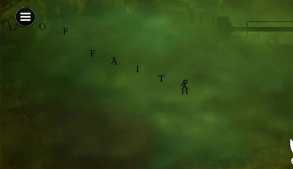 1、字母人HERO从山坡上滚下后路被堵住,需要向前冒险,HERO向前跑跳下通道,踩着木板向下到中间的平台,会遇见第一句箴言,在跳上去向右边跑,推着字母F和它的其他的字母伙伴相遇组成FAITH信仰。