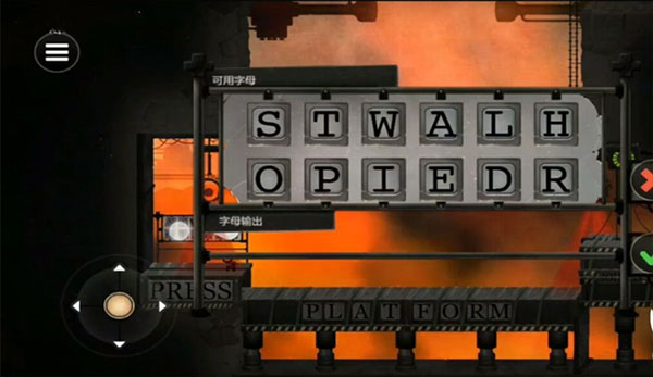 9、展开字母盘组成SOILD结实的,跳到单词上,向前注意跳跃的时间跳过火堆,跳下去后在左边组成LIE谎言,小人会将怪物拦住组成LOVE爱成为保护罩,HERO推着向前。