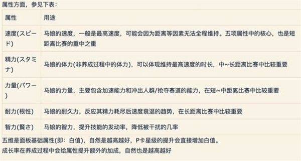 从图中我们可以看到五项属性所分别引导的关于马娘组成的数值。并且明显的可以看出根据赛距长短,需要的属性有所不同如何提升数值呢?除了最普遍的技能卡提升,训练提升外,还有基因继承,自身开花以及觉醒等游戏中种种提升数值的手段训练提升除了主属性提升外,也会提升部分副属性以及增加技能点