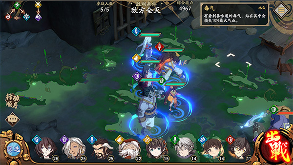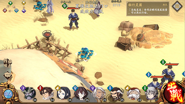 游戏中加入了多种机关和地形,如灵脉、毒气地势等,这些元素为战斗增添了策略性和挑战性。初始角色各有特色,玩家需要熟悉每个角色的技能和属性,才能合理搭配通关。