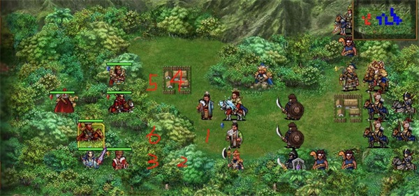 徐晃:长枪兵,有袭扰,有异常攻击,会助攻,攻击距离很远,每回合会回血(我的夏侯2下才能砍死他,有回血的情况下3下),所以第一回合先干掉