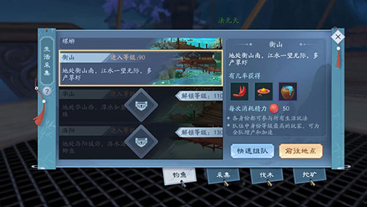点进去之后,就有一个前往钓鱼的按钮,然后选择一处你想去钓鱼的地方,每个地图的产量都是不一样的,等级越高钓出来的东西越好,在这里我们就选择衡山好了。