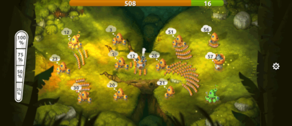 当首领拥有一定实力(人(菌)口)后,便可以调兵遣将向四周进行扩张。出征时,可以通过调节左侧的百分比进度条,选择不同建筑内想要派出的士兵数量比例(25%、50%、75、100%)