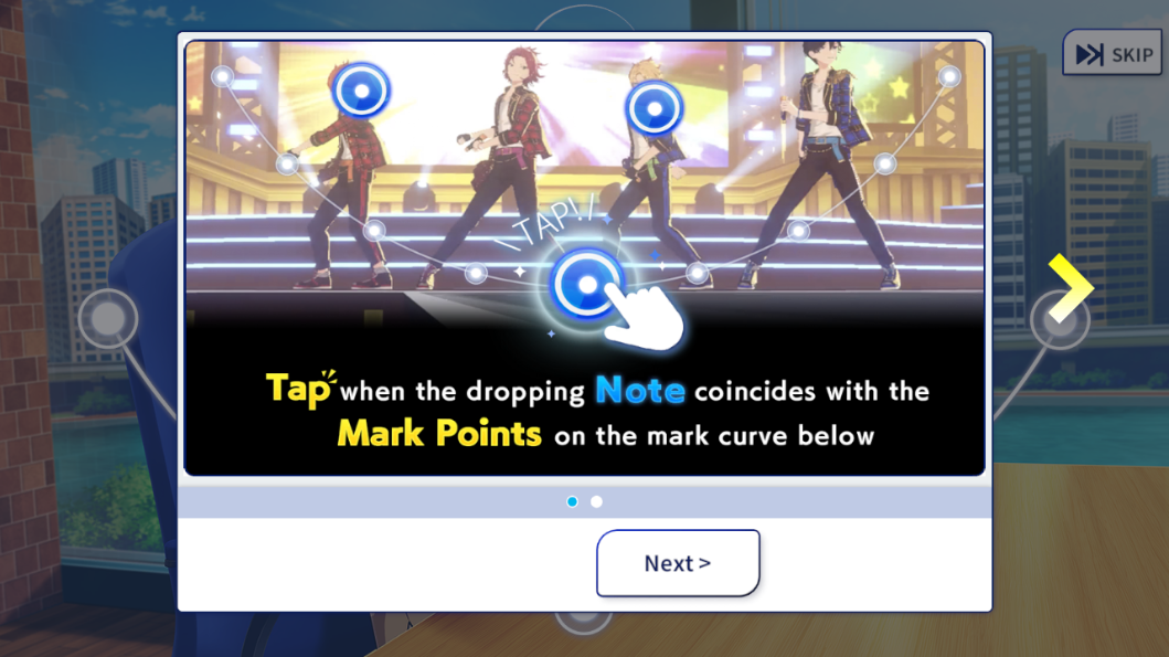 3、对话结束后,会出现一段教程,玩家可以仔细看下;下图的意思就是当落下的蓝色圆形与下面标记曲线上的白点重合时,玩家需要点击;