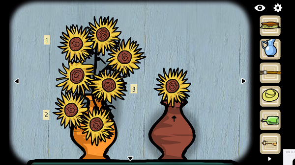 按照如图所示顺序点击左侧花瓶中的【向日葵花朵】,右侧慢慢抬升的向日葵会带出一把【小钥匙】