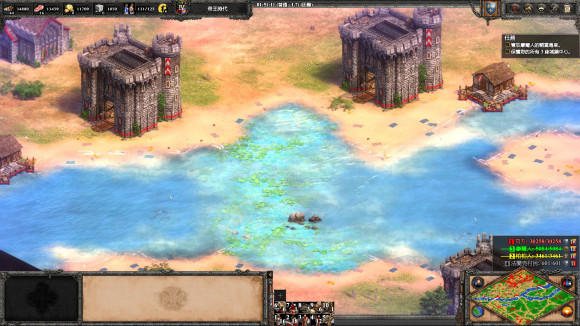 3、 建城墙把三座桥封死, 然后升城堡时代到9点中的浅滩造两座城堡, 发育一段时间后就可以反攻了。 两个敌人都没什么守军, 城堡时代就可将迦菲奇杀死, 然后攻克摩尔人的阵地, 把车领出来, 送回家过关。
