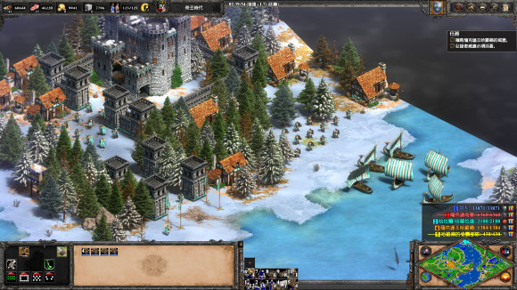 4、然后在格陵兰岛西岸新建船坞和运输船,准备登陆文兰在8点钟方向有一小岛, 岛上有个英雄叫伯德, 是一个开发者的名字, 把他收了 (老版只能杀死), 带着大军登陆纽芬兰岛。 先建个城堡, 然后把岛上的阿尔冈昆武士 (本质是靛蓝突袭者) 和民兵都吸引到城堡底下解决, 然后不需要盖什么房子TC的, 直接派兵把紫色原住民的TC和兵营拆除即可胜利。