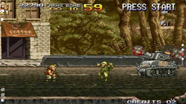 采用经典的2D像素点绘画风,snk御用画师作画,场景角色完美还原,枪械战车悉数登场