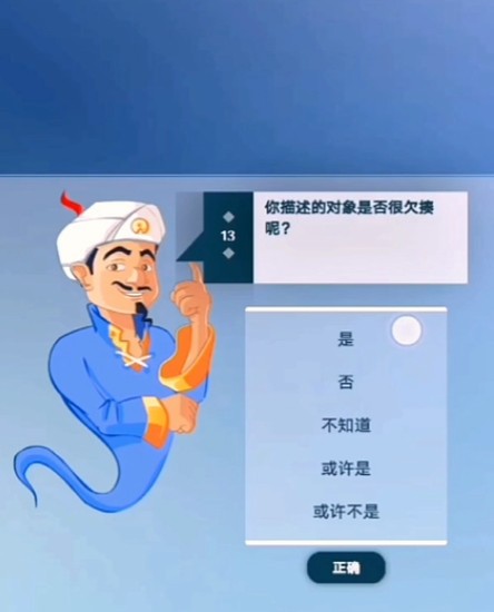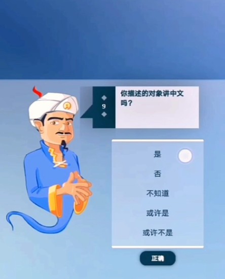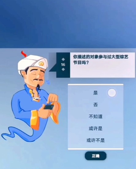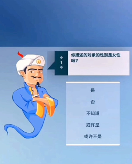 网络天才网易版横空出世,全中文界面,全新的Akinator灯神皮肤,为他换上炫酷好看的服装帽子吧~还有名人排行榜供玩家参考,在这里可以看到谁被猜中的次数最多,可以挑战最快猜出名人,在最新的超级奖项或荣誉殿堂写上你的名字!这位伴随人工智能技术成长起来的互联网“全知”灯神可以通过小小的问答游戏猜出的心中所想哦!在问答环节中玩家需要坚定心中的虚拟/现实人物,按照设定选择“是”、“否”、“不知道”、“或许是”、“或许不是”,灯神会根据你的选择将错误结果一 一排除,最终得出你心中真正的答案。赶快下载试试吧,到时候你就会知道真正的网络天才有多智能!就像那传说中无所不知(全知)的阿拉丁神灯之灵!另外网络天才网易版听起来很像“网络天才网页版”对不对,其实我也体验了网络天才网页版入口,从官方的网址链接进入无需下载即可游玩,所以小编做了一系列灯神猜名人的玩法体验!感兴趣的朋友可以关注本页面浏览~
