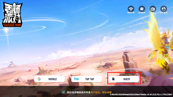1、首先进入香肠派对国际测试服首页,点击左下角的“Guest游客登录”快速开始;
