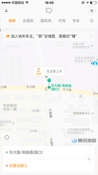 用户只需登录滴滴客户端,点击“在这里上车”即可快速约车;