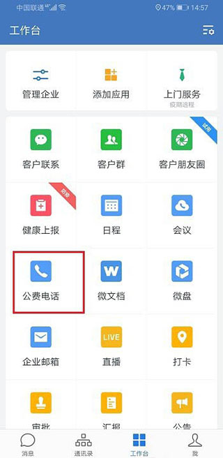 2、下面我们来使用一下公费电话,打开企业微信,点击公费电话,选择打电话,如下图所示: