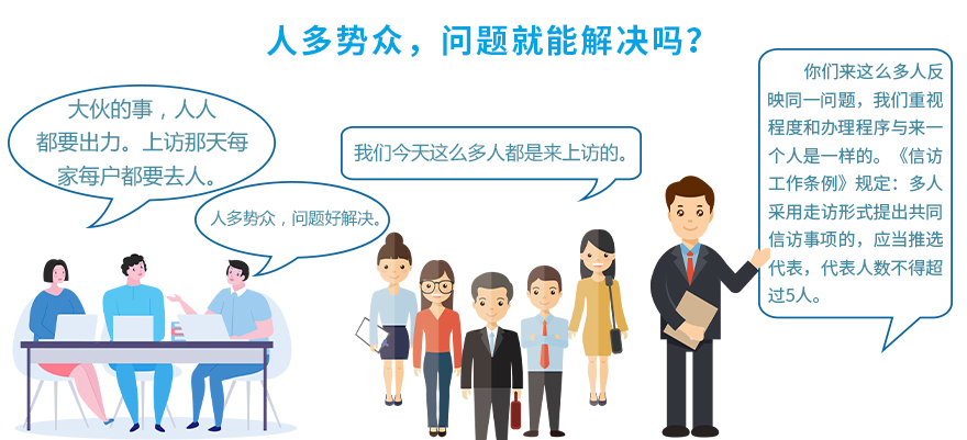 信访诉求需依法逐级提出,以走访形式提出信访事项的,应当到有权处理的本级或者上一级机关、单位设立或者指定的接待场所提出。多人采用走访形式提出共同的信访事项的,应当推选代表,代表人数不得超过5人。