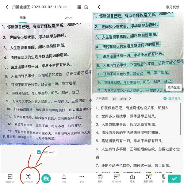 第二步,利用图片右下角的相机拍照,或者直接点击右上角从手机相册中导入图片。拍好照片后,可以拉动八个圆点,选择你要的段落,然后打钩。