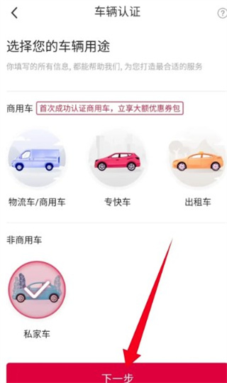 2、在车辆认证界面,选择车辆用途,点击下一步。
