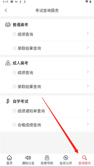 4、点击“查询服务”,用户可查询自己的高考分数、录取结果等。