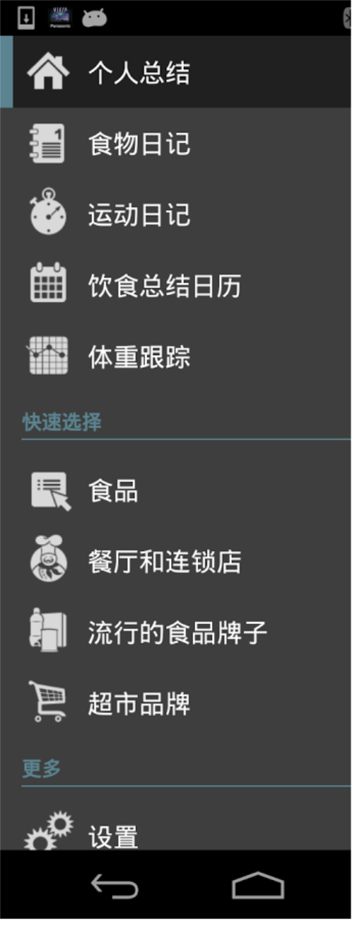 2、主界面分为快速选择、我的计数器两大类别,其中“快速选择”功能主要用于查找食品,餐厅和连锁店,流行的食品牌子以及超市品牌等相关内容;而“我的计数器”功能为用户提供了食物、运动方面的日记,以及饮食总结功能。另外值得一提的是,软件中加入了最为专业的体重跟踪系统,用户可以轻松掌握自己饮食中摄入的卡路里含量