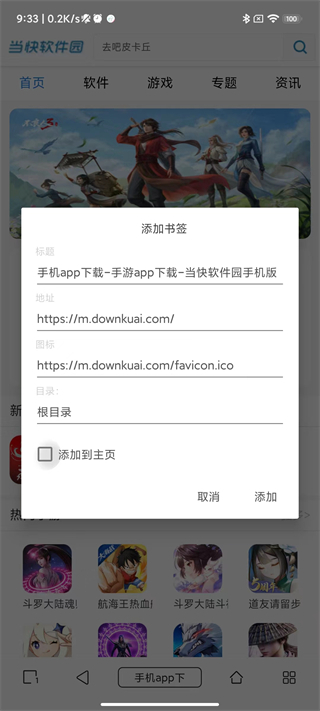 4、点击第二排第二个添加书签按钮即可,根据自身情况选择是否添加到主页;