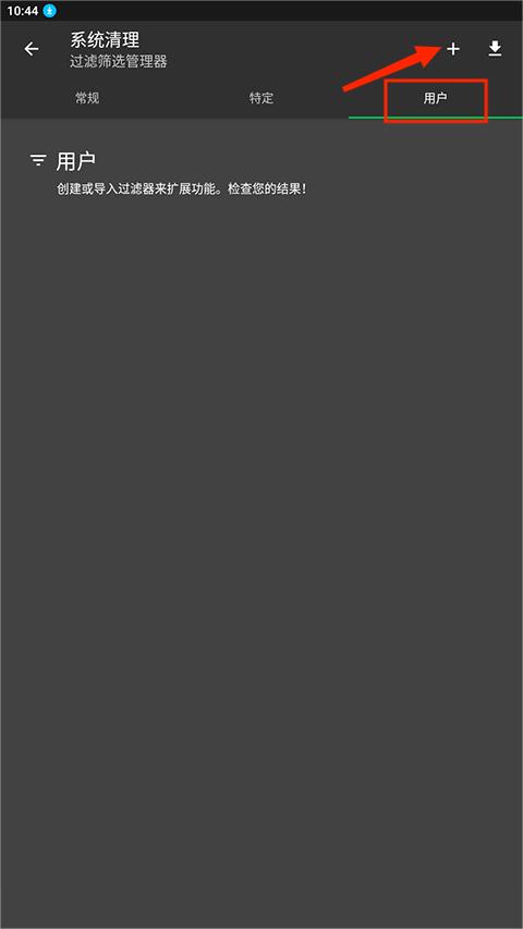 3、在筛选管理器界面,切换至“用户”标签页,并点击右上角的“+”号,开始添加个性化清理规则。