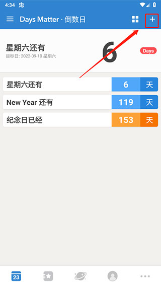 4、在倒数日界面,点击“+”按钮,可以在重要的日子下方添加更多纪念日;