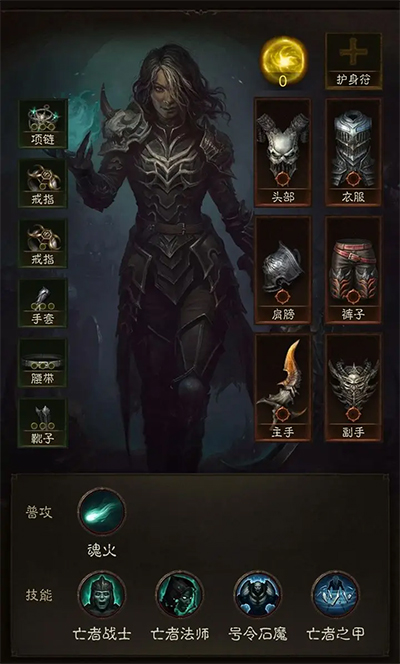普攻及技能选择:魂火、号令石魔、亡者法师、亡者之甲、亡者战士。