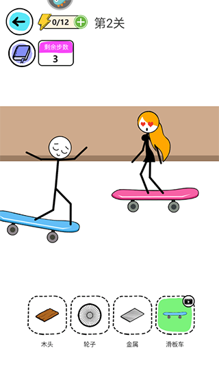 游戏里的关卡设计特别新鲜,每次过关都需要动点歪脑筋,不是聪明就能过的那种,而是得有奇葩的想法才行。火柴人冒险的画面也挺有趣的,而且每个谜题都有对应的场景,画风搞怪,让人忍俊不禁。比如第二关里,看到美女就追上去,还能用滑板炫酷耍帅,简直像在演电影!